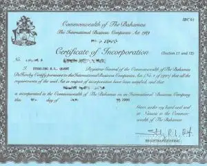 A Certificate of Incorporation certifies that a company was duly incorporated in the Bahamas under the International Business Companies Act. It includes the company's name, registration number and date of incorporation.