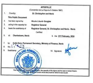 Apostille Stamps in St Kitts and Nevis can be obtained to authenticate official documents such as Birth, Death and Marriage Certificates, Police Certificates, Certificates of Good Standing, Certificates of Incorporation, and other documents issued by the Registrar of Companies or certified by a Notary Public in the Federation (including powers of attorney and affidavits).